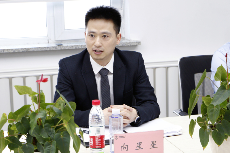 向星星代表英国桑德兰大学致辞。他表示很高兴能有这次面对面交流的机会,通过观看学校宣传片了解到两校在专业设置、本硕连读合作模式、创客空间等方面非常匹配,他还表示桑德兰大学旅游管理专业在全英排名前五,两校在特色学科方面也有很多契合点。他希望通过此次合作为学生带来切合实际的好处,向本部申请多样化的奖学金、助学金名额帮助学生尽快就读桑德兰大学硕士专业。同时在彼此合作的基础上,通过师生互访、学术论坛等活动加深交流。
