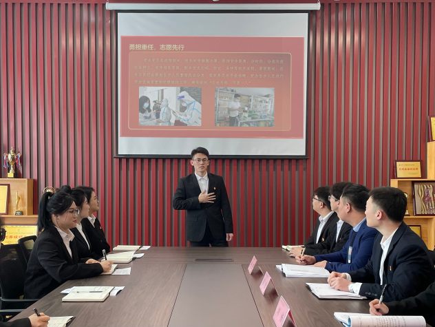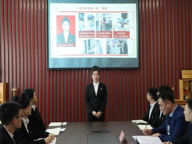学生党员闫振卓以“弘扬抗疫精神,争做新时代合格党员”为主题分享了在疫情防控期间积极参与抗疫志愿服务,在疫情期间她勇显担当,第一时间主动请缨参加抗疫先锋突击队,协助老师、医护人员开展核酸检测工作。