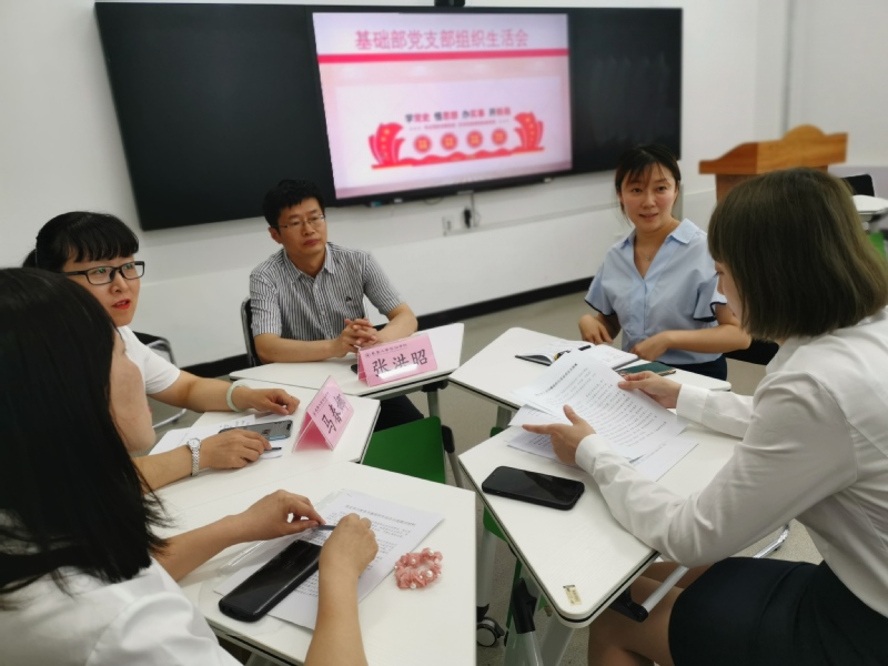 7月14日11点40分,基础部党支部在金沙官网101智慧教室召开了党史学习教育组织生活会。会议由基础部党总支书记马春娜主持,党委书记张洪昭、组织部部长许乔木出席了会议。