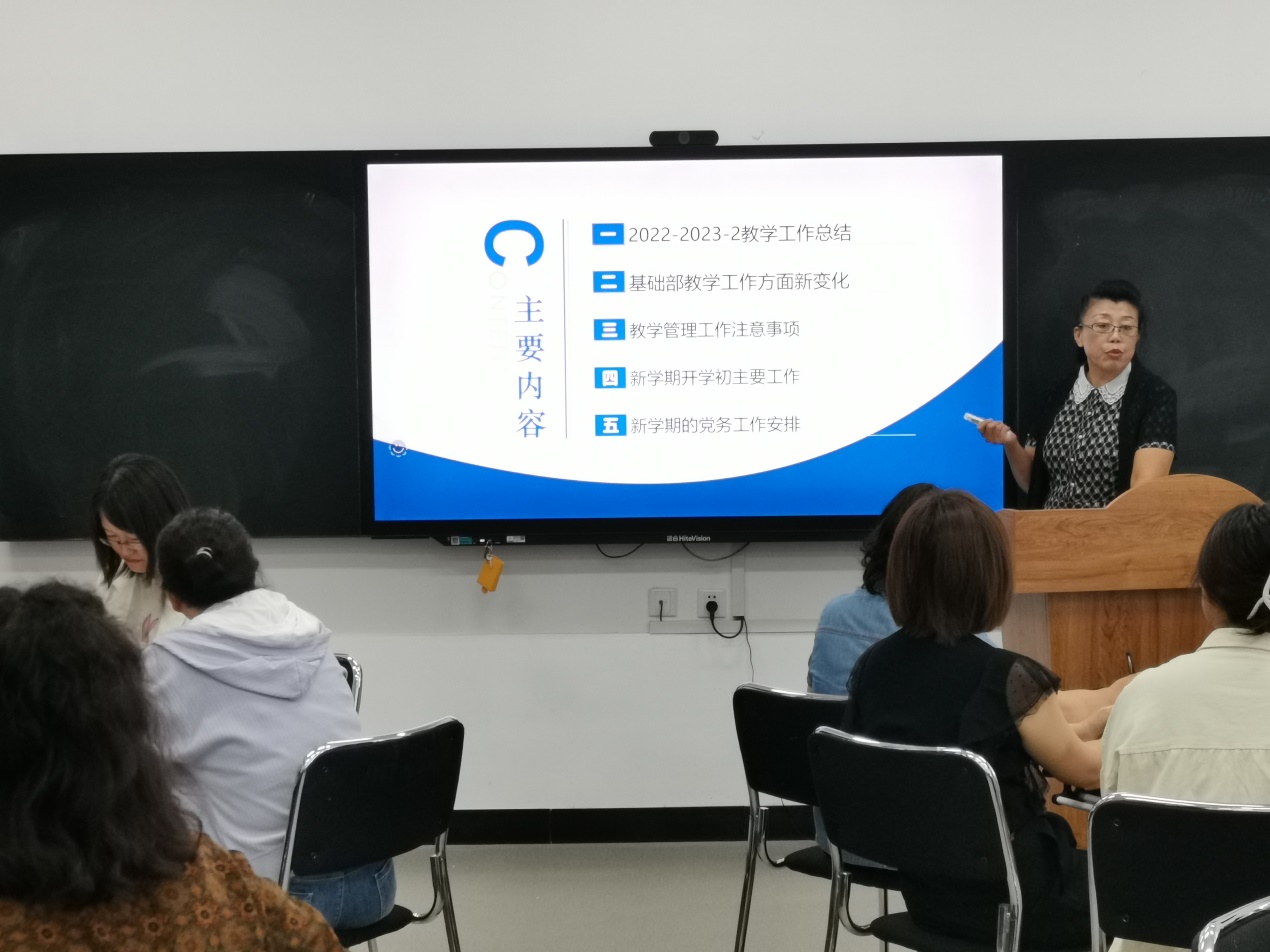 为使基础部每一位任课教师了解本学期工作的重点和工作方向,基础部主任齐洪英从9个方面总结上学期工作,详细解读2023级人才培养方案变更的部分(基础部课程名称、课程内容、课程学时),提醒各教研室主任按时完成2023级教学大纲修订,希望全体教师再接再厉继续发扬以往工作成绩,一分耕耘一分收获,号召基础部全体教师为基础部教学质量提高贡献力量。