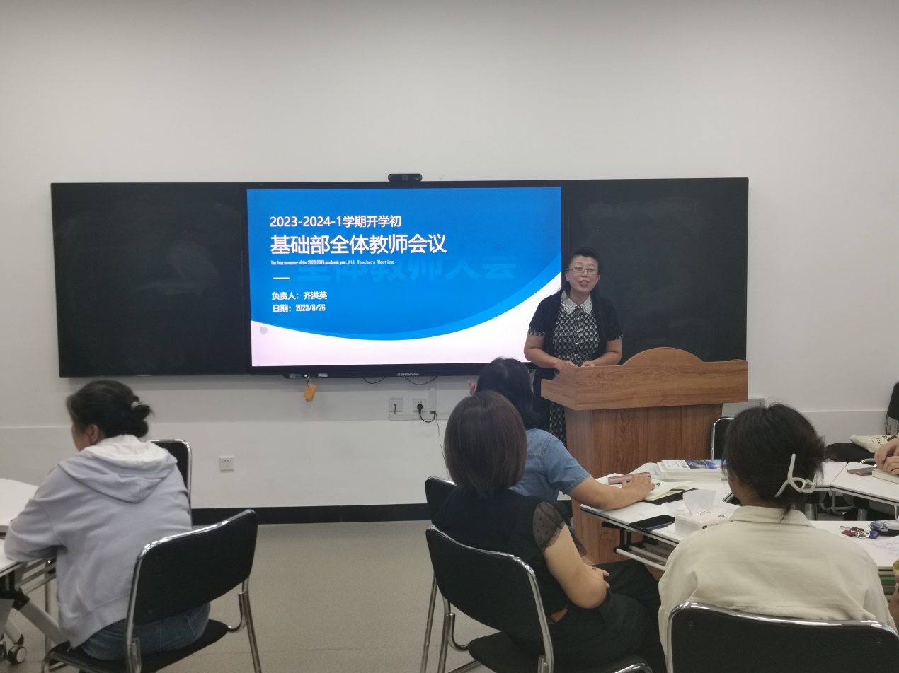 带着金秋的喜悦,迎来了新的学期,开启新的希望。8月26日上午8:30,基础部在101召开新学期任课教师大会,大会由基础部主任齐洪英主持,共有42名教师(专职和外聘)参会。
