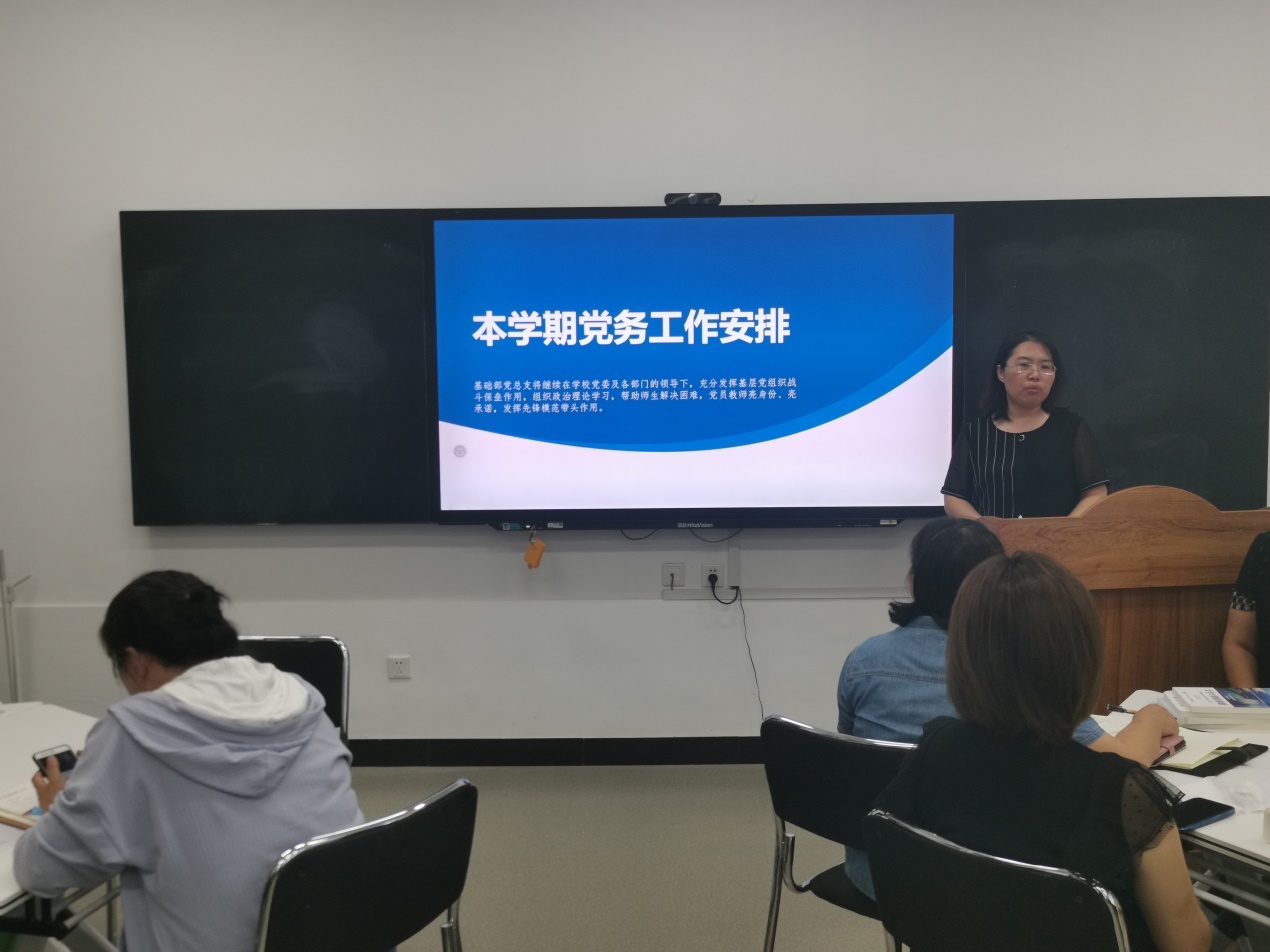 为基础部党务工作正常开展,基础部党总支副书记王落茹强调基础部党总支将继续在学校党委及各部门的领导下,充分发挥基层党组织战斗保垒作用,组织政治理论学习,帮助师生解决困难,党员教师亮身份、亮承诺,发挥先锋模范带头作用。