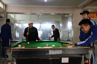 志愿者们准备了精彩的相声表演‘三口绝’、精彩歌舞等,为老人献上了精彩的慰问演出。表演结束后志愿者们陪老人打台球、下象棋。