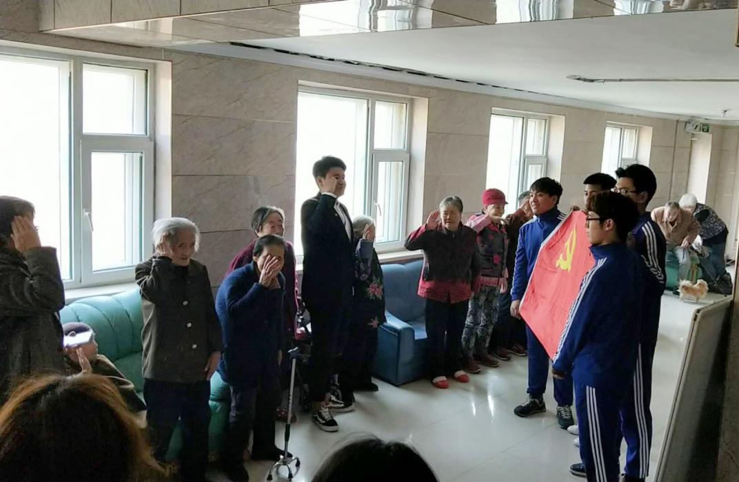 敬老院中不乏有很多老党员,在演出结束后,志愿者代表向老人讲述十九大精神,让老党员重温十九大,感受党的不断壮大,讲述过程中老党员不由自主的站了起来,向党旗敬礼。最后大家伴着歌声,结束了本次志愿活动。