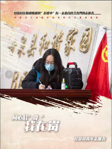 高鑫同学参与了陕西省延安市甘泉县的疫情防控工作,主要负责与区里社区工作人员在当地防控卡点站岗,为民众守好防线。在此次志愿服务中,她不仅感受到了一线抗疫人员的辛苦,也感受到了众志成城、抗击疫情的伟大精神。高鑫同学说:“通过社会实践活动,我们不仅传递了温暖,也磨炼了自身的意志,更涵养了自己的品格,希望我们可以早日战胜疫情。延安加油、陕西加油、中国加油!”