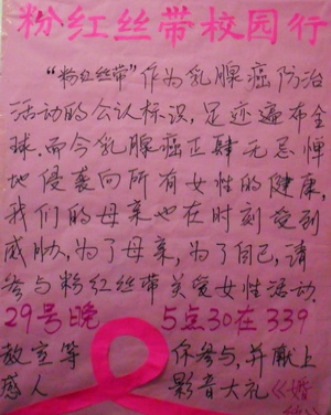为了响应国际“关爱女性,关注女性健康”的号召,普及乳腺癌相关知识,提高对母亲和自己健康的关注程度,提早让母亲和自己的健康多一份保险,给予乳腺癌病人一份关怀,一份爱心。2010年10月29日,金沙官网心蕊志愿者协会外语分会的志愿者们,开展了一次特别的校园志愿活动。