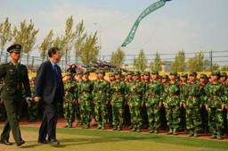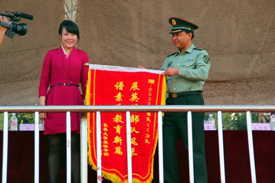 董事长于芳向承训部队领导赠送锦旗授旗 学院领导陈波升教授在部队领导陪同下检阅部队