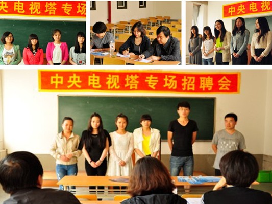 2013年5月8日下午,中央电视塔工作人员在我院中心教学楼多媒体室举行了专场招聘会。通过招聘专题片,使学生了解到关于中央电视塔更多更全面的信息,对招聘职位、岗位要求有了清晰认识。 中央电视塔是集广播电视发射和旅游观光、餐饮娱乐为一体的综合性建筑,为国家级AAAA级景点,不仅拥有独特的高空观景,同时也是体验电视文化的高塔旅游胜地。 此次中央电视塔向我院主要招聘综合服务人员,我院各专业共有200多名学生参加此次招聘。 本次招聘,通过层层面试的方式进入下一面试程序。经过电视塔工作人员的认真审核考察,63名学生经过激烈的选拔进入初试。再经过一番角逐有26人进入复试。面试现场气氛紧张而热烈。应聘的学生个个精神饱满,谈吐大方。他们各尽所能,充分展示自己的才华,以昂扬的姿态彰显出自我的优势。最终有10人脱颖而出,获得了实习岗位。他们灵活的应变能力、良好的个人素质以及积极进取的精神赢得电视塔工作人员的一致认可。