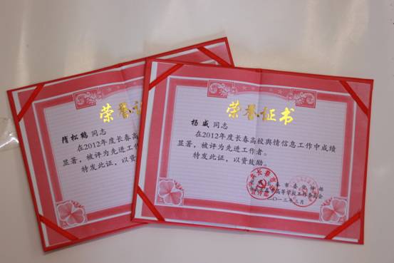 近日,中共长春市委宣传部、中共长春市高校工委对2012年舆情信息工作表现突出的单位和个人进行了表彰,我院党委办公室副主任杨威、学生工作部干事隋松鹤两名同志喜获“长春高校舆情信息工作先进工作者”荣誉称号。