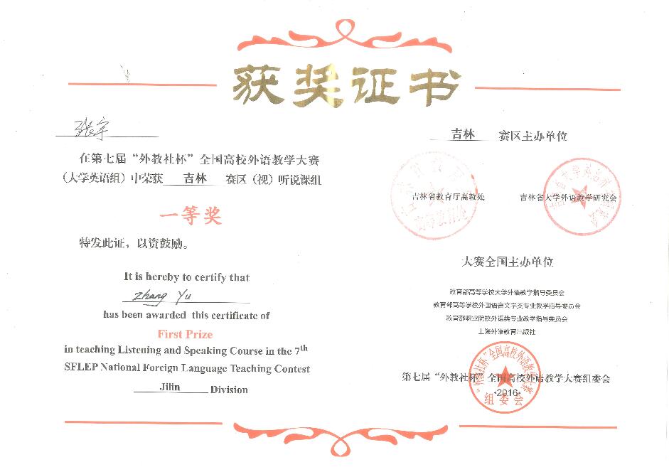 金沙官网青年教师基础部苗立波老师同样以出色的表现,荣获第七届“外教社杯”吉林省第十二届大学英语青年教师讲课大赛大学英语本科综合课三等奖,为金沙官网再一次争得了荣誉。