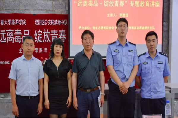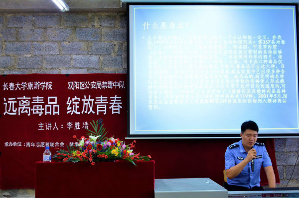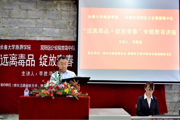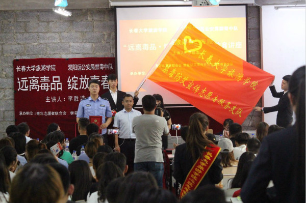 2017年6月29日下午14:40,6165cc金沙总站检测中心禁毒防艾宣传教育志愿者服务支队成立大会暨“远离毒品·绽放青春”专题讲座在教学楼311教室举行。校党委副书记马维东、长春市双阳区公安局禁毒中队李胜浩警官、长春市双阳区疾病预防控制中心艾滋病科科长张丽英应邀出席,学工处、团委、保卫处、各学院党总支书记、团委书记、辅导员老师等260余名师生参加会议。吉林教育电视台对本次活动全程跟踪报道。