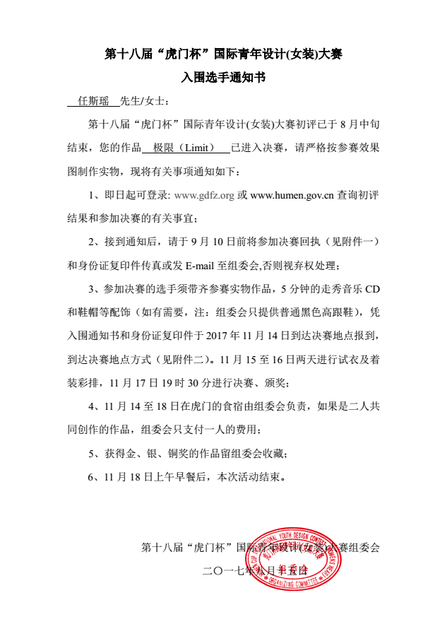2017年8月11日,第十八届“虎门杯”国际青年设计(女装)大赛参赛作品初评在广州国际轻纺城举行。本届大赛以“超越·自我”为主题,经过评委的严格甄选,从3122份作品中选出30份作品进入决赛,金沙官网艺术学院14级学生任斯瑶的作品“极限”成功入围决赛。
