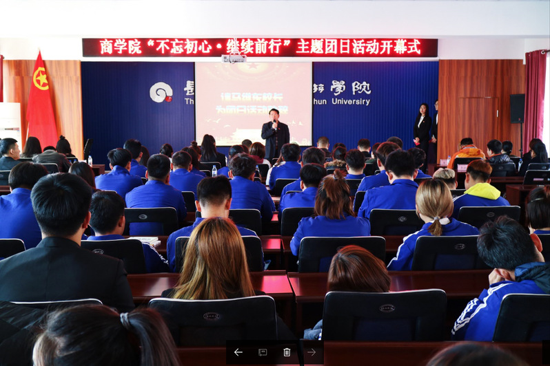为深入贯彻学习党的十九大精神,激励同学们把爱国热情化作圆梦中华的实际行动,商学院团委于2017年11月14日在校行政楼报告厅隆重举行“不忘初心·继续前行”主题团日活动开幕仪式。学校副书记、副校长马维东,团委书记贾烊,学工部、武装部副部长李桂林,商学院团委书记蒋森共同为活动剪彩。