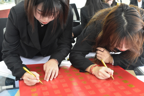 绘制过程中,同学们积极参与,按部就班,将涂好红颜料的画布吹干后,用金笔逐一书写一百种不同字体的“寿”字,最后用裱框装订起来,整个过程有条不紊、分工明确、配合默契,顺利地完成了本次制作。同学们笔下的“寿”字不仅饱含了对老人的祝福之心,更彰显金沙官网学子爱老敬老的责任与担当。