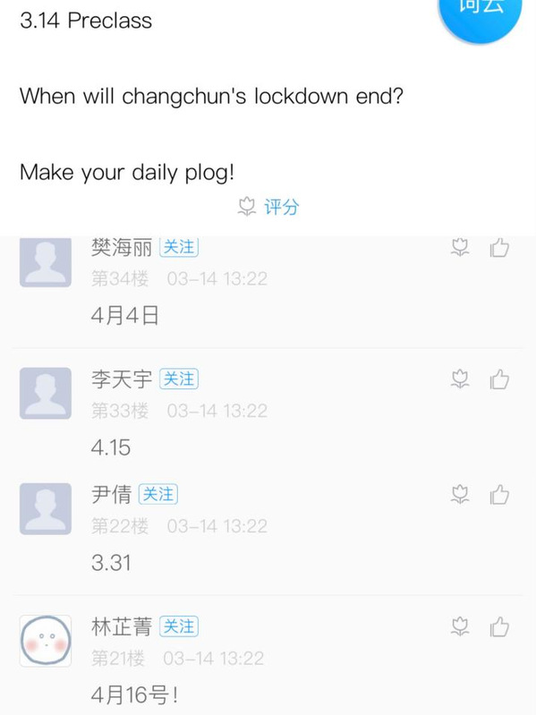 基础部《C语言程序设计》任课教师崔天明通过课前发放调查问卷了解学生线上学习条件及学习状态,介绍分享了“健康码”的相关资料,引申出学习本课程的意义,让学生对如今人手一个的健康码对疫情防控起的重要作用有了进一步的认识。《大学英语2》任课教师孙光宇借体育盛事东风,正值双奥结束之际,带领学生做手势版动画视频《雪龙吟》,鼓舞学生爱国情义,同时宣扬众志成城精神。《大学英语4》任课教师李晔课前利用学习通的【主题讨论】功能发起讨论:“When will Changchun’s lockdown end? Make your daily plog”,用时下大学生喜欢的图文方式来记录自己的日常生活,大学生乐于分享生活,Plog形式轻松,这样做的目的是希望学生们能够有计划、有意义的进行隔离学习生活。