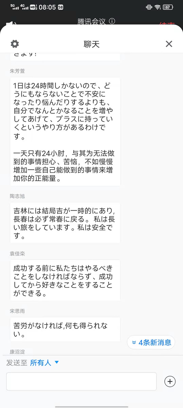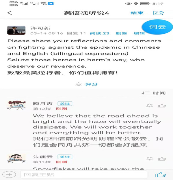 外国语学院《英语视听说4》任课教师许可新在课前先通知学生熟悉《你的答案》这首歌。课前三分钟一起即兴合唱,让同学们的心情随着歌词和伴奏而充满力量,与此同时,使用学习通平台发布关于抗疫话题的“双语主题讨论”,有效融入课程思政元素,潜移默化的提升学生英语思辨能力。《翻译理论与实践》任课教师胡雅楠在课前以温馨的话语去关怀、温暖学生,用日语知识与学生开展互动、交流,通过温情的语言舒缓释放学生的压力。