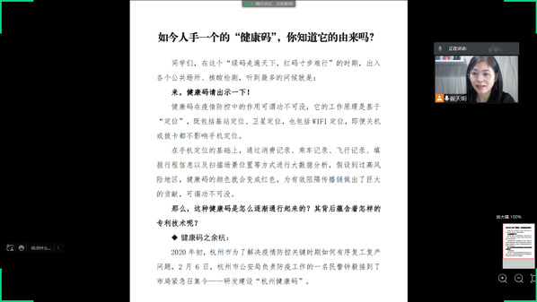 人工智能学院《分布式文件系统》任课教师武兴睿通过播放马晓东发明健康码,无偿给国家人民使用的视频,使学生们意识到大数据在国家重大事件发生时所发挥的关键作用,以及科技研究者们对国家健康、稳定、安全、强大的重要性,使学生感受到“爱”的重要性,“爱”是科技研究者奋斗的力量。《数据处理基础》任课教师郑雨晴在课前3分钟用扫二维码的方式向学生讲述长旅的抗疫故事。她首先在课前播放轻松愉快的音乐,展示做好的二维码,指引学生用微信扫一扫,展示文字内容。讲解二维码的原理以及用wps的制作过程演示。既让学生用此技术表白爱意,感恩父母,感恩爱你的人,又可以将专业知识融入其中。