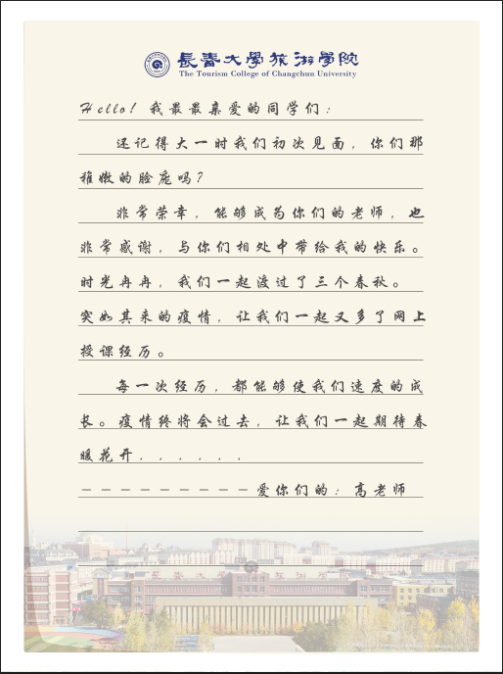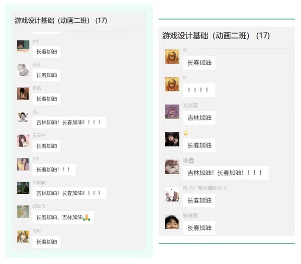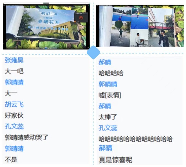 为了让学生更直观地感受这封信的内容,高华老师搜集了学生从大一到大三生活和学习的照片,连夜为第二天上课的学生录制并制作了视频《让我们一起期待春暖花开——致19级动画二班全体同学一封信》。视频通过照片墙的形式记录了学生大一到大三的生活,还加入了长旅防疫的图文,让学生了解到疫情期间,长旅师生正在齐心努力着,保护他们的安全。学生们看到高老师特意为他们制作的视频,非常感动且深受鼓舞,纷纷为长春加油打气。