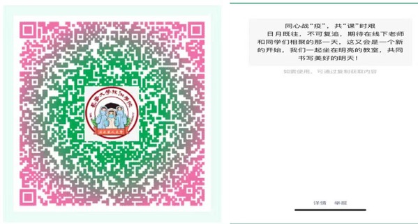 全校教师同心同德,以仁爱之心进行“心灵守护”,为学生的线上教学保驾护航。通过战“疫”思政课、共情专业课等多种形式,引导青年学子自觉担负应有的社会责任,为战胜疫情贡献自己的力量。