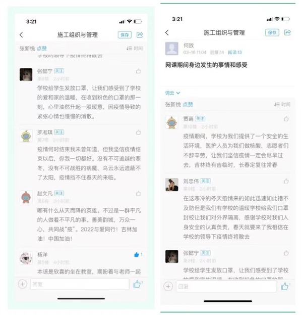 工学院工程造价专业杨晓辉老师课前组织“一起为吉林加油,长春加油”活动;土木工程专业课前发起讨论活动,同学们纷纷表达了封校日子里的喜怒哀乐;工程管理专业教师将前一天准备好的春日美景视频通过屏幕共享播放,看到春日生机盎然的美景,同学们纷纷赞叹,也将自己手机中长旅风景和宿舍照片分享给老师和同学们。