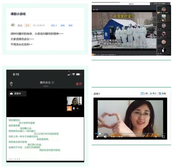 为有效开展“课前暖心三分钟”活动,学校教务处多次组织召开线上教学工作会议,大家群策群力、集思广益,鼓励教师们通过各种渠道、运用各种举措调动学生积极性,排解学生因封校而产生的心理压力。全校各教学单位充分发挥集体智慧,根据不同学科专业特色,精心设计“课前暖心三分钟”小活动,如观看抗疫视频、即兴合唱+独唱、教师自制视频短片、名画欣赏、学生作品展示、普及百科知识等,在教会学生如何以积极、正确的心态面对疫情的同时,也达到了传递知识的良好效果。