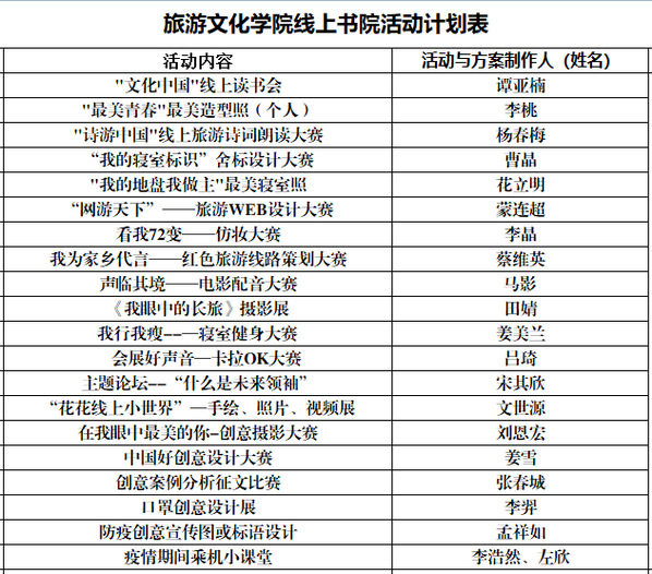 为了更好利用当前疫情防控社会大课堂的丰富资源,培养家国情怀、提升人文素养、增强防控意识,促进学生从危机中获得成长,旅游文化学院的各位班导师按照学院实施的“书院制”方案,积极推进“线上书院”活动,丰富学生的课余生活,同时对学生进行“心灵守护”,坚定战胜疫情的信心。
