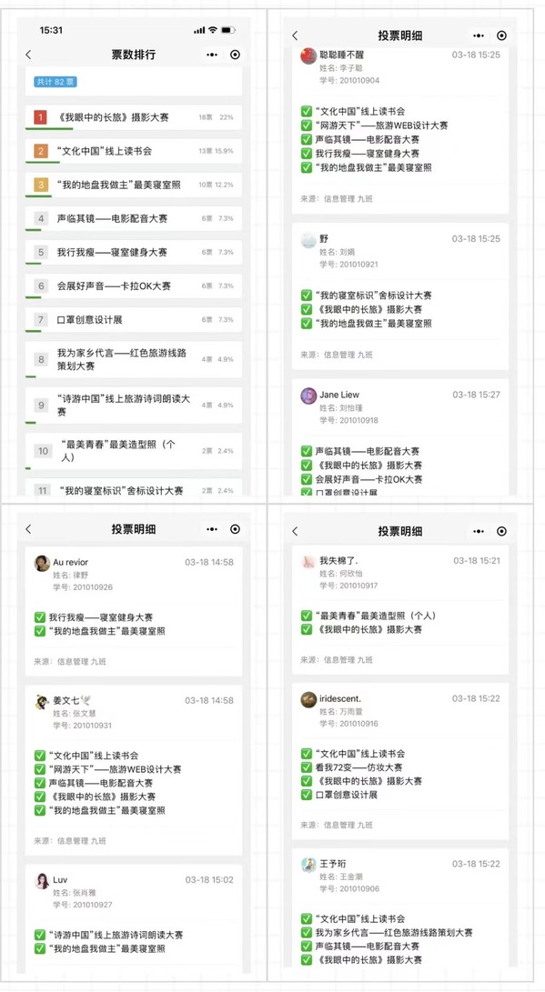 九班同学对各项书院活动反响强烈,积极报名参与,最终通过小程序激烈投票选出人气最高的《我眼中的长旅》摄影大赛、“我的地盘我做主”最美寝室照、“声临其境”电影配音大赛、“我行我瘦”寝室健身大赛、“文化中国”线上读书会5个活动,在未来几周内依次开展。同学们纷纷表示非常期待线上书院活动的开始,希望从活动中收获成长、收获快乐!