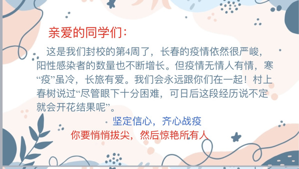 自吉林省疫情发生以来,全校教师在学校党政领导班子的带领下,坚决贯彻习近平总书记关于疫情防控工作的重要讲话指示精神,认真落实省委、省政府工作部署和学校各项工作要求,牢固树立“一盘棋”思想,扎实开展线上教学工作,广泛开展了“课前暖心3分钟”活动,积极关注学生的思想动态和情绪变化,有效开展心理疏导和干预,稳定思想、增强信心。