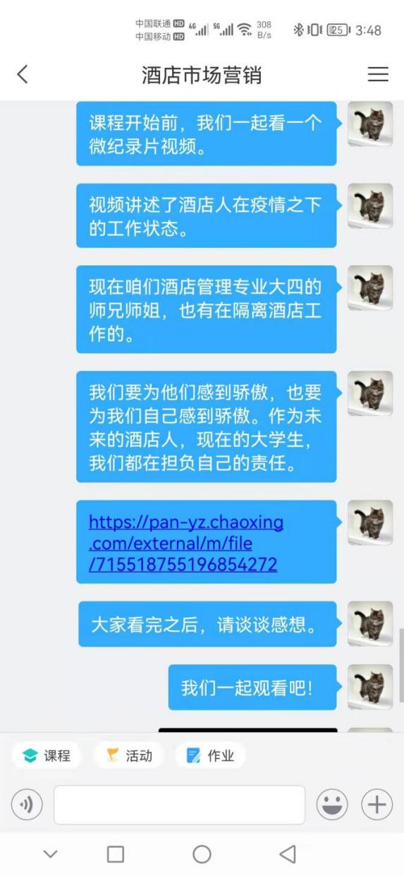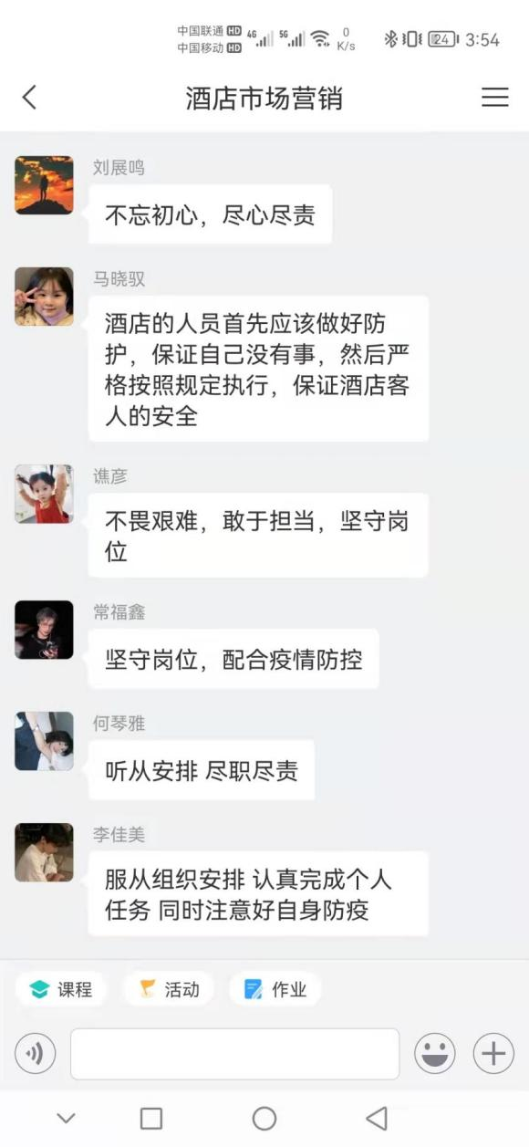 《酒店市场营销》任课教师李桃课前带领同学们观看了微型纪录片《微光-致敬酒店人》。视频用第一人称的视角,讲述了酒店人不畏困难、无惧疫情、坚守岗位的故事。看完视频后,老师带领同学们思考这样的话题:酒店人在疫情期间,应该承担怎样的责任?如果你是视频里的员工,你能做到她这样吗?同学们纷纷提出自己的观点和看法,认为无论身在何处,都应该尽职尽责,如果不能冲在抗疫第一线,那么顺应着静态管理的趋势,慢下来、静下来、稳下来,等待春天也是我们的职责。