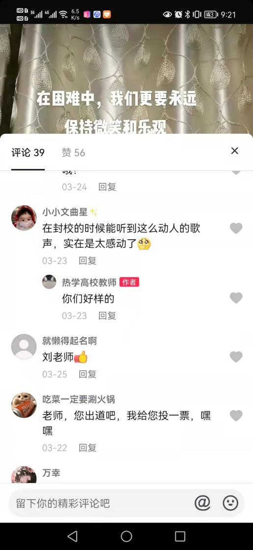 新冠病毒来势汹汹,虽然疫情使我们无法在校园见面,但是“云端”相聚也别有一番滋味。在校园封闭的情况下,工学院的莘莘学子们正以自己的方式在奋斗、在努力、在传播信念、在根植信仰。工程造价专业教师李丹阳利用课前3分钟时间分享同学们在疫情发生后创作的诗歌,与同学们共勉。