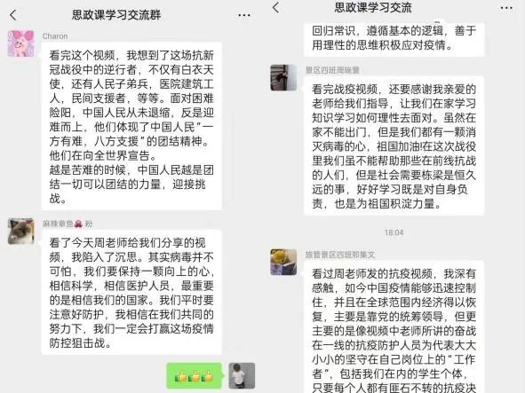 本期思政微课上 ,学生进行了热烈的讨论,纷纷表示应理性面对疫情,“宅”在寝室,既是对个人的负责,也是对学校和社会的负责,相信疫情终将过去。