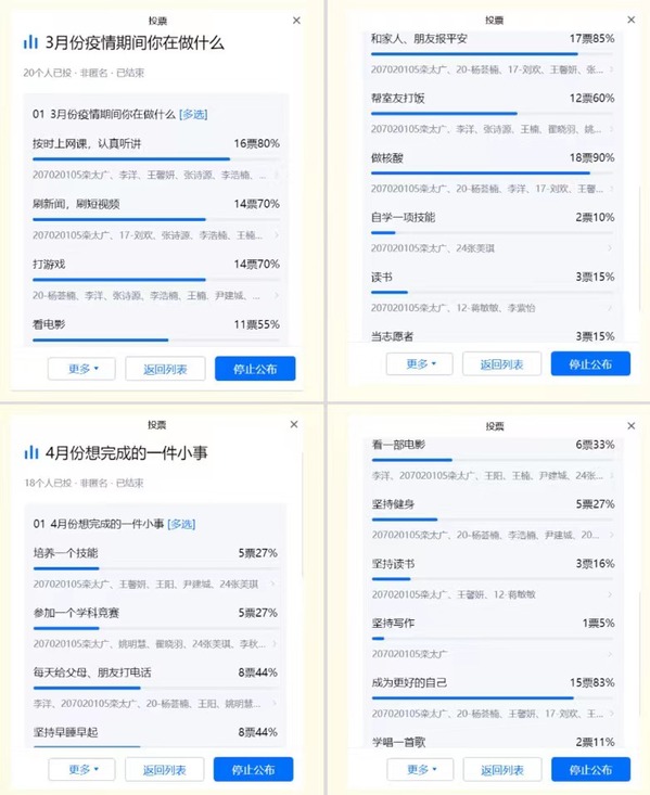 通过播放央视公益广告——科学抗疫情、健康你我他,坚定抗疫决心,用科学的态度面对疫情,并发起投票“3月份疫情期间你在做什么”“4月份想完成的一件小事”,同时建议学生们对刚刚过去的3月份进行总结,4月份要珍惜时间做有意义的事,不负青春。