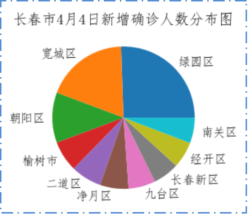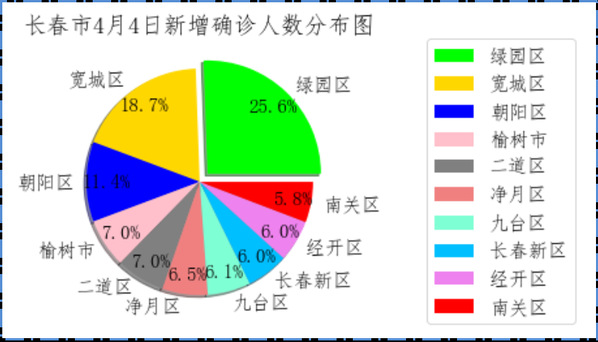 案例数据:(节选摘自吉林省卫健委官网公告)2022年4月4日0—24时,长春市新增本地确诊病例604例,其中绿园区150例、宽城区110例、朝阳区67例、榆树市41例、二道区41例、净月区38例、九台区36例、长春新区35例、经开区35例、南关区34例。