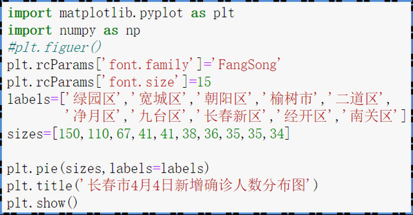 在线上学习的过程中,将疫情数据作为数据可视化教程内容嵌入到课堂教学中,在学习专业知识的同时,让同学们了解疫情发展情况。例如,我们利用饼图来绘制吉林省当前疫情人数变化,让同学们更直观地看出吉林省各区域疫情分布的情况。