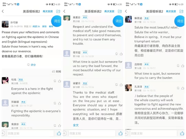在学习通发布“抗疫主题”相关的双语好句,例如:坚定信心、同舟共济、科学防治、精准施策to strengthen confidence and solidarity and take science-based and targeted measures,给学生详细讲解词句的使用,以便丰富课堂内容,活跃课堂气氛,激发学生的学习兴趣。