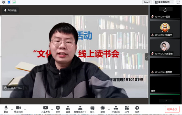读书会持续近两个小时,很多同学都意犹未尽。最后,同学们表示,在疫情期间我们更要大力弘扬当代大学生求知创新、努力奋进的精神,多读书、读好书。通过这次读书会的举办,有效地激发了学生们读书的热情,未来将会以此读书会为契机,举办更多的读书交流活动,带动更多同学一起阅读,一起感受文化中国的魅力。