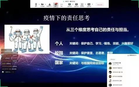 2020级和2021级2个班级22名同学在线参加班导师武兴睿发起的主题班会。武兴睿老师在班会伊始提出,疫情是灾难、是大考,更是教材,并从政府在行动、最美逆行者、青年要担当三个版块对疫情下的责任与担当进行阐释,同学们对此展开了讨论和发言。