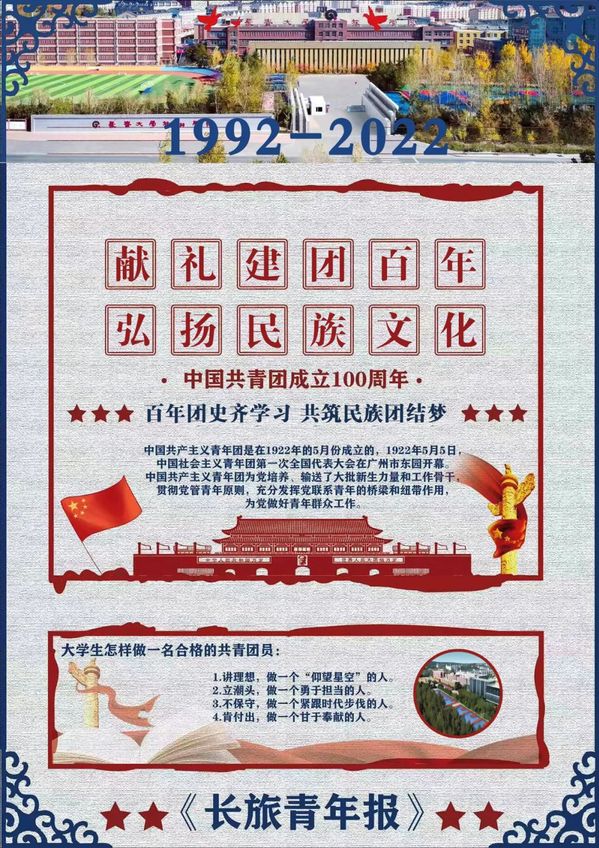 海报设计内容将学校特色景观、建筑物、文化标识等元素融入庆祝中国共青团成立100周年中,引导同学们发挥自己的专业特长,利用形象生动的画面展现中国共青团百年历史,用华丽的视觉效果描绘中国共青团的百年光辉岁月。接下来跟着小编一起欣赏艺术学院海报设计作品的第一期吧!