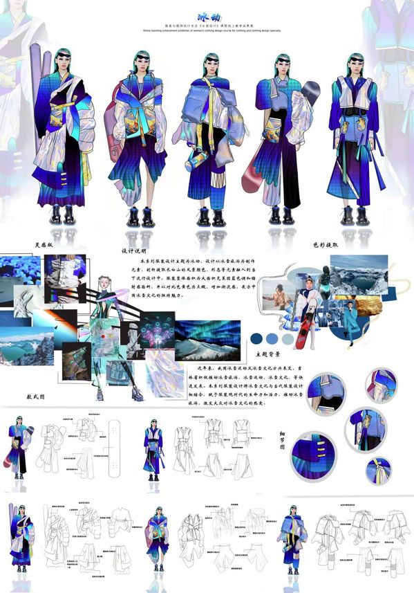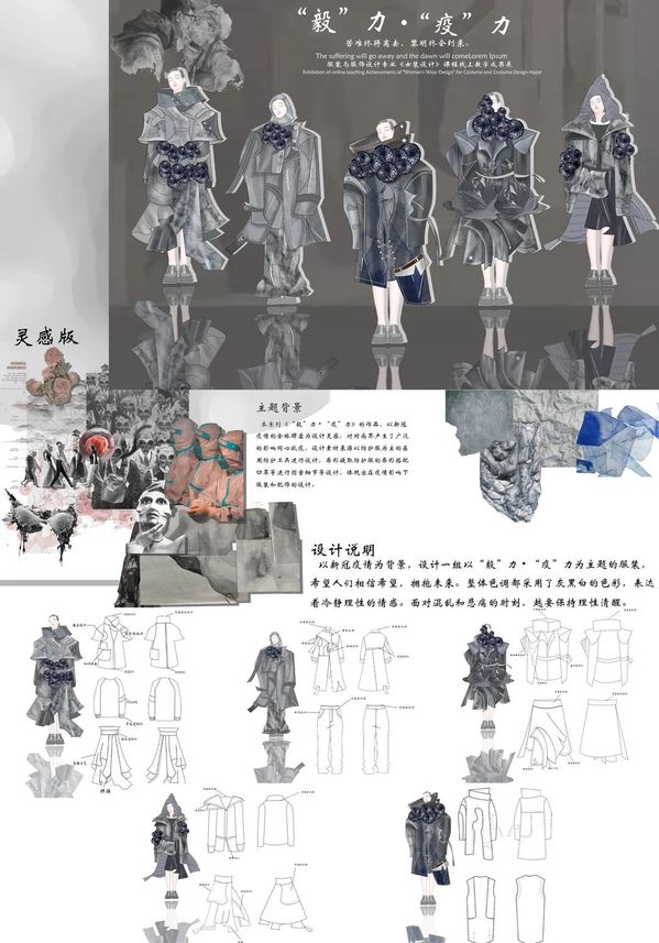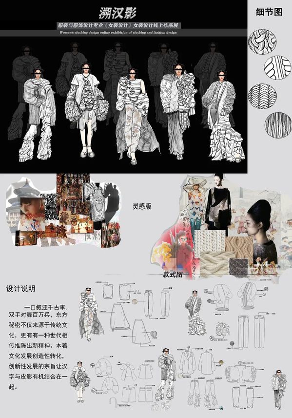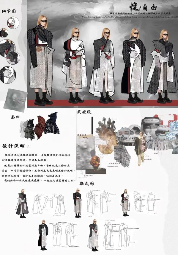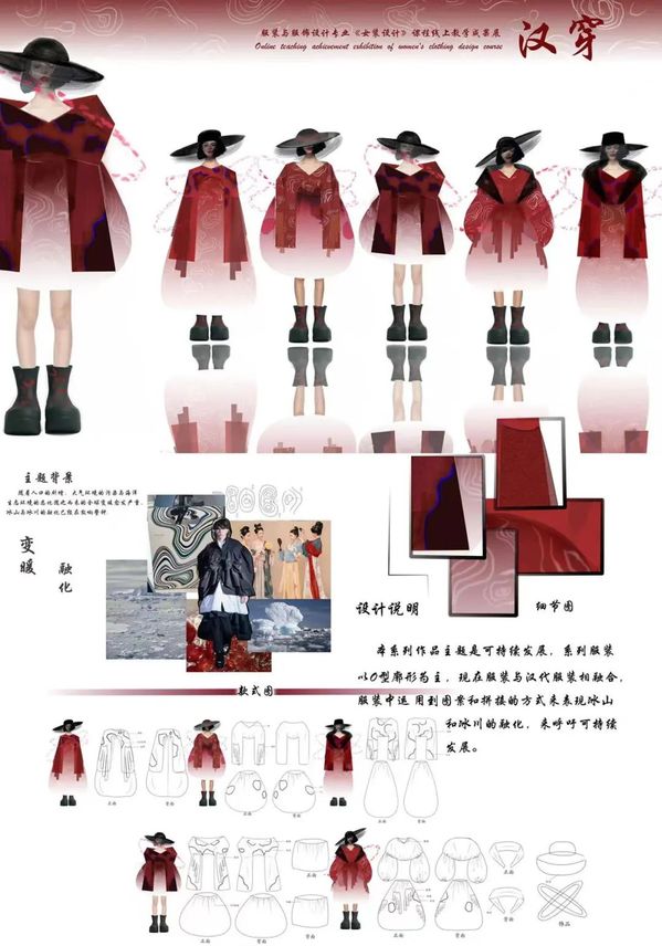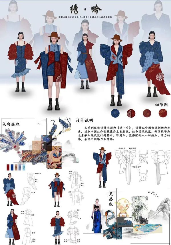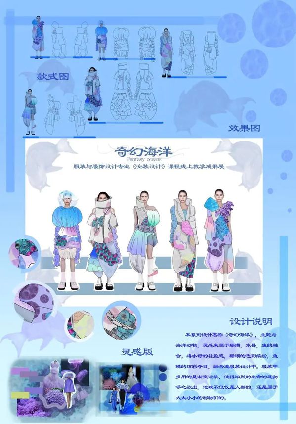 本期来自服装与服饰设计专业,根据课程时间安排,以课程组或班级为单位,展示了学生从主题诠释、灵感来源、设计图到成品展示的创意过程,旨在培养学生女装创新设计能力,掌握女装款式设计的特点,提升学生的设计表达能力、流行趋势把握能力,建立女装设计的创新思维模式。