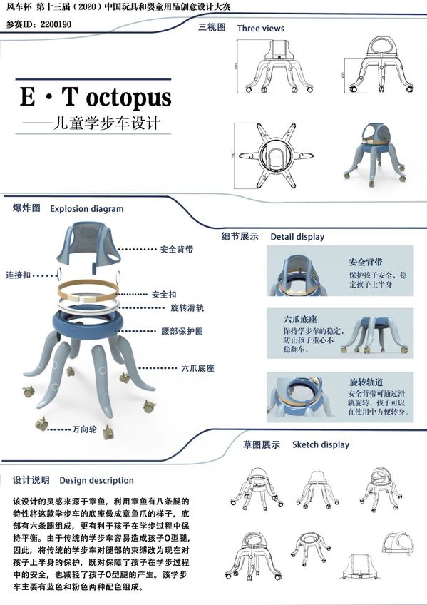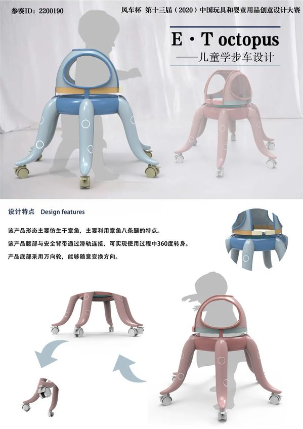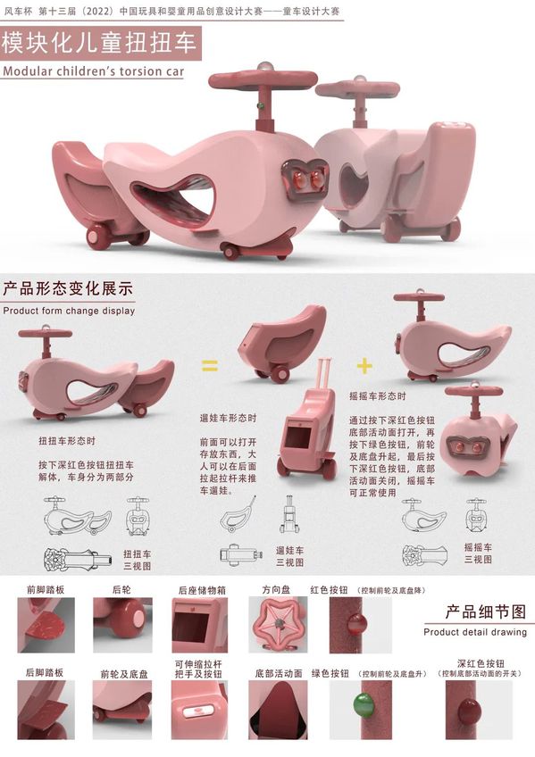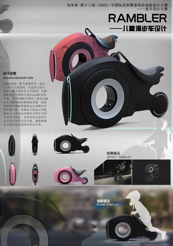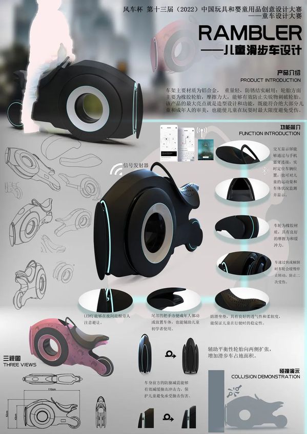 《玩具设计》课程是产品设计专业的特色课程,主要针对当前热门玩具产品进行专题设计。本次课程任务与2022年中国玩具和婴童产品设计大赛——童车设计(儿童自行车、儿童滑步车、儿童滑板车、儿童平衡车、儿童推车、儿童溜娃车或相关周边产品设计)相结合。主要锻炼学生思维创造力与实际操作能力,培养学生新型玩具开发设计能力。虽然受到疫情影响,但《玩具设计》这门课程的教学质量不减反增,在学生与教师的配合之下,创作出诸多优秀作品。