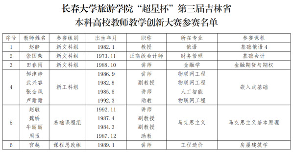 根据吉林省教育厅、吉林省总工会《关于举办“超星杯”第三届吉林省本科高校教师教学创新大赛的通知》文件要求。经基层教学单位推荐,学校组织校赛选拔,现拟推荐邹津婷等六名/组教师参加高校教师教学创新大赛活动(详见附件)。