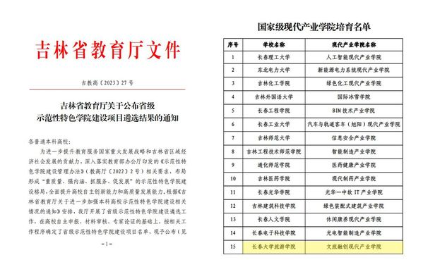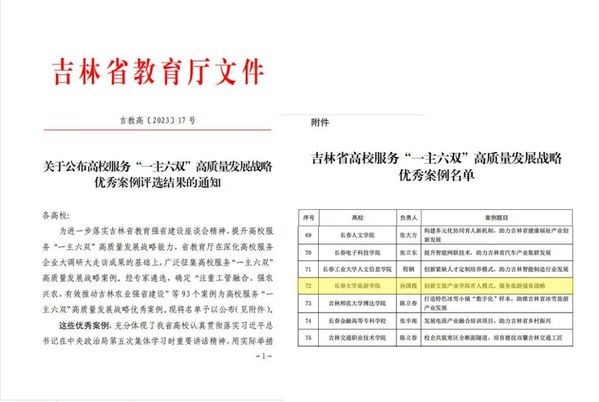 学校聚焦“一主六双”高质量发展战略之旅游“双线”空间布局,围绕我省万亿级旅游支柱产业和建设冰雪强省、文化强省的战略目标,加快培养模式改革和产教融合创新。学校“文旅融创现代产业学院”获批国家级现代产业学院培育项目;学校与长白山开发建设(集团)有限责任公司共同申报的“长白山文旅定制班”获批紧缺人才培养定制班第二批省级培育项目;“6165cc金沙总站检测中心卓越文旅人才实践教学基地”获批吉林省“高水平文科校外实践教学基地”立项;“创新文旅产业学院育人模式 服务旅游强省战略”案例获批吉林省高校服务“一主六双”高质量发展战略优秀案例;学校入选软件和信息服务(数字技术)行业产教融合共同体副理事长单位;全面推进现代产业学院建设,现已建成13个产学研深度融合的产业学院,构建“政行企校”协同发展模式,大力开展“吉乡农创园”创建,促进了教育链、人才链、产业链、创新链有效衔接,学校服务地方经济发展能力显著提升。