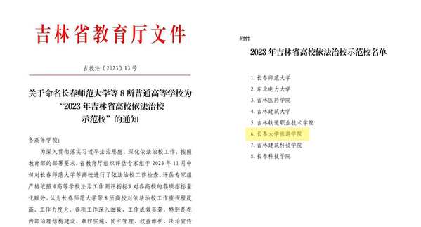 2023年12月,学校被吉林省教育厅命名为“吉林省高校依法治校示范校”。近年来,学校认真贯彻习近平法治思想和习近平总书记关于教育的重要论述,努力构建了以学校章程为核心、以现代大学制度建设为基础、以法治文化为底蕴的依法治校工作格局,切实把依法治理作为学校办学治校的基本理念和基本方式,融入并贯穿学校工作全过程各方面。学校结合民办高校体制机制特点,依法依规设置董事会、监事会、学术委员会等机构,创新构建董事会决策、校长负责、党委政治保障、监事会监督、教授治学、民主管理“六位一体”的治理体系,建立健全党政联席会、校长办公会、党委会、党建工作例会、教学工作例会“五会”工作体制,高站位、高标准、高质量、高效率推进依法治教、依法办学、依法治校,不断提升学校治理体系和治理能力现代化水平,为学校各项事业高质量发展提供了有力保障。