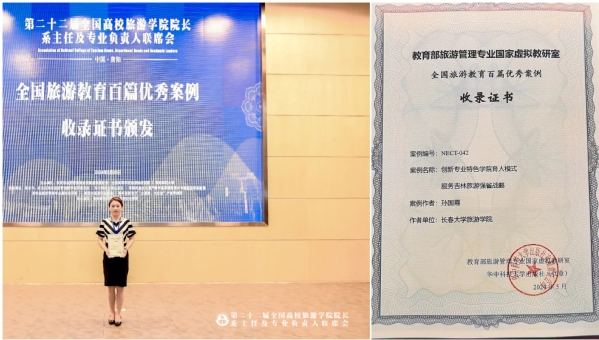 在会议闭幕式上,教育部旅游管理专业国家虚拟教研室为全国旅游教育百篇优秀案例举行了证书颁发仪式,孙国霞负责的题为《创新专业特色学院育人模式服务吉林旅游强省战略》的案例脱颖而出,被组委会收录在册。