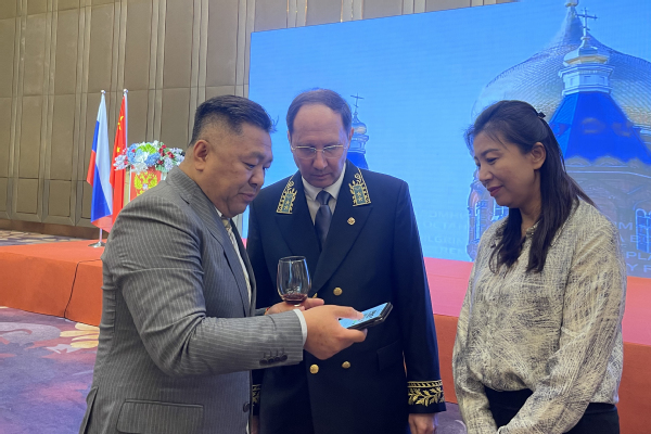 在参加俄罗斯国庆招待会期间,程越向契尔年科总领事介绍了学校的概况及与俄罗斯高校合作情况,同时推介了东北亚长旅号(国际)旅游班列项目。契尔年科总领事表示支持学校与俄罗斯高校在俄中文化年框架下开展友好合作,并对东北亚长旅号(国际)旅游班列项目产生浓厚兴趣。