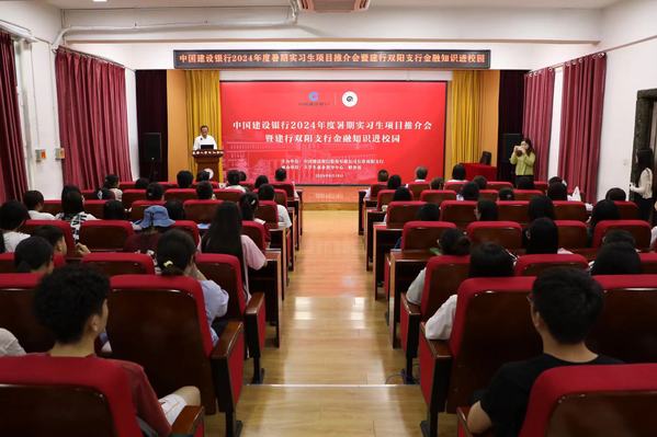 为更好地服务学生实习实践,做好留省就业创业工作,同时对学生进行科学预防非法集资宣传教育,6月18日,学校邀请建行双阳支行在筑梦报告厅举办中国建设银行2024年度暑期实习生项目推介会暨建行双阳支行金融知识进校园活动。建行双阳支行行长赵峰、副行长马俭、个金部消保工作经理秦学英、综合部人事经理于丹彤,学校副校长贾烊,财务处处长李浩丹,大学生就业指导中心主任姚玉新、副主任王娟及近200名学生参加活动。活动由姚玉新主持。