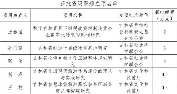 近日,吉林省哲学社会科学规划基金办公室、吉林省社会科学联合会和吉林省文化和旅游厅陆续公布了2024年度基金项目立项名单,金沙官网共有5项课题获批立项,获经费资助共计9万元。希望各项目负责人严格按照立项单位项目管理要求,扎实推进项目研究进程,争取产出一批高水平研究成果,提升金沙官网在相关学科领域的学术影响力和竞争力,为学校高质量发展贡献力量。