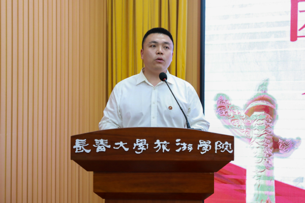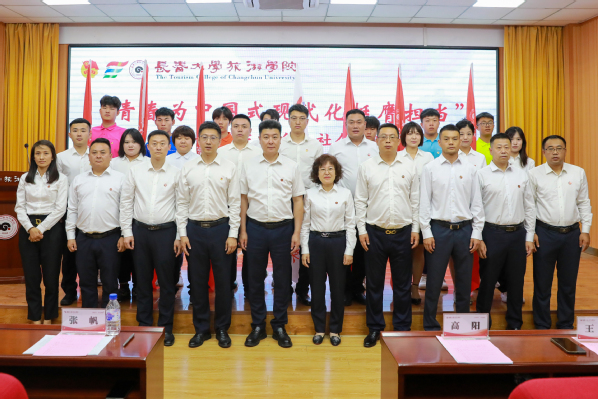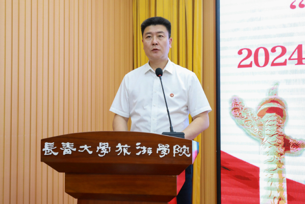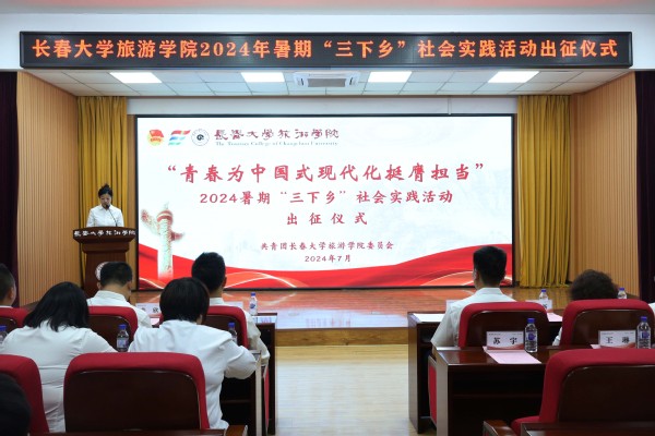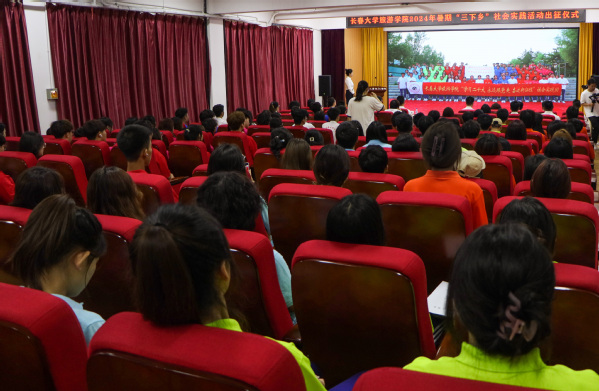 挺膺担当,强国有我。为深入学习贯彻党的二十大精神,落实习近平总书记在新时代推动东北全面振兴座谈会上的重要讲话精神,引导长旅学子跟着总书记的脚步看吉林,在吉林上好与现实相结合的“大思政课”。7月9日,学校“青春为中国式现代化挺膺担当”2024年暑期“三下乡”社会实践活动出征仪式在筑梦报告厅举行。学校党委副书记高阳出席仪式。团委,学生工作处相关负责人,马克思主义学院院长,各学院党总支书记、团委书记,团队指导教师及青年志愿者共计140余人参加出征仪式。仪式由校团委专职团干部于凯主持。