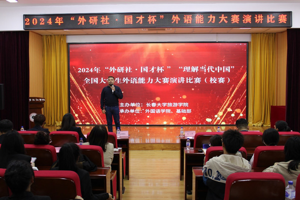 比赛开始前,外国语学院院长彭又新在讲话中表示,此次校赛决赛的举办,旨在通过比赛促进学生语言技能的提升,鼓励大家以全新的视角审视中华文化,从而深化对传统文化的理解与尊重,展现长旅学子对习近平新时代中国特色社会主义思想的理解能力。进一步深化学校外语教学改革,创新课程思政,努力培养能够讲好中国故事、服务国际传播、勇担重任的应用型人才。