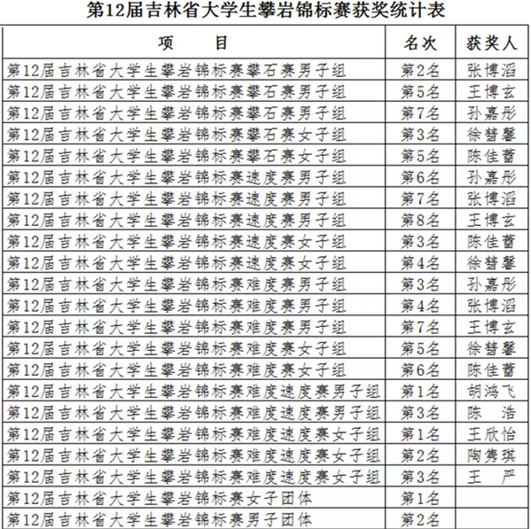 近日,第12届吉林省大学生攀岩锦标赛在长春大学拉开帷幕。学校攀岩代表队在体育教研部副主任周冰和教师姜雪琦、王建东、姜海洋带领下,摘获2金2银5铜,学校获得甲B组女子团体赛第一名、男子团体赛第二名。